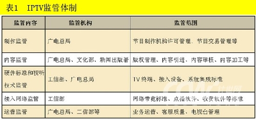 根據(jù)國務(wù)院直屬部委機(jī)構(gòu)的職能劃分,國家將信息產(chǎn)業(yè)、廣播電影電視產(chǎn)業(yè)分別交給工信部和國家廣電總局管理。由表1可以看出,在IPTV的監(jiān)管方面,國家廣電總局起著舉足輕重的作用,尤其是關(guān)于節(jié)目制作和運(yùn)營方面的監(jiān)管,對IPTV的發(fā)展影響重大,隨時都有可能出臺新的規(guī)定,影響整個IPTV的發(fā)展。