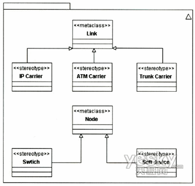 該擴(kuò)展針對(duì)Link和Node和兩個(gè)元類增加了NGN中關(guān)于承載和節(jié)點(diǎn)的定型。可以根據(jù)需要對(duì)該模型作進(jìn)一步擴(kuò)展,如可以增加關(guān)于接入網(wǎng)承載的定型等。