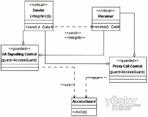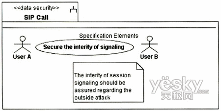 圖3中的UA代表UserA或UserB的UA,因?yàn)閮蓚(gè)UA的信令交互需要通過Proxy,且其安全需求是一致的,故在圖中只表現(xiàn)出一方。UA和Proxy均是基于通用計(jì)算平臺(tái)的節(jié)點(diǎn),其訪問控制需要受到保護(hù),故對(duì)其標(biāo)記上定型《guardedaccess》。UA中除處理信令外,還需處理媒體流的編解碼與控制,這個(gè)用例中只涉及信令的安全性,故在UA中只關(guān)注進(jìn)行信令控制的組件。UA與Proxy之間的通信基于IP承載,根據(jù)表1定義的威脅函數(shù):ThreatA(IP