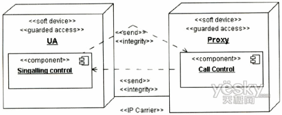 下面以基于SIP的兩方會(huì)話為例說明如何使用UMLsec描述業(yè)務(wù)安全需求。假定兩方呼叫發(fā)生在同一SIPProxy轄域的兩個(gè)用戶之間,要求保證用戶UA與SIPProxy之間的信令的完整性,不能被非法入侵者篡改。該場(chǎng)景的用例圖和部署圖分別如圖2、圖3所示。