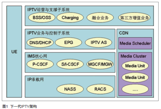 下一代IPTV架構(gòu)按功能屬性總體上劃分為UE、IPTV運(yùn)營與支撐子系統(tǒng)、IPTV業(yè)務(wù)與控制子系統(tǒng)、CDN內(nèi)容分發(fā)網(wǎng)絡(luò)、IMS核心網(wǎng)和IP承載網(wǎng)五個(gè)子系統(tǒng),如圖1。