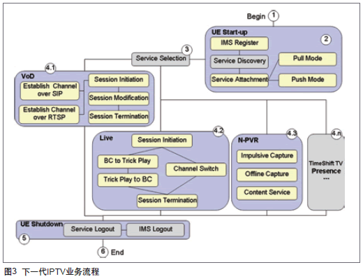 基于網(wǎng)絡(luò)視訊框架的下一代IPTV的業(yè)務(wù)流程具有完整的生命周期,其生命周期始于UE開機(jī)階段,活躍于業(yè)務(wù)使用階段,終止于UE關(guān)機(jī)階段,如圖3。其細(xì)分的業(yè)務(wù)流程包含以下6個(gè)子階段: