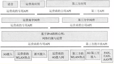 在某種意義上,下一代網(wǎng)絡(luò)必須是一種可編程的、基于IP的網(wǎng)絡(luò),這必然要求XG為應(yīng)用開發(fā)提供強大的、方便的、定義明確的API。對于一些業(yè)務(wù)提供商來說,API思想本身并非僅僅是一個基本概念。目前,公共API是指所有第三方都可用的API,它包括標準的、開放的API子集。另一方面,專用API是指由某個公司控制、僅僅在公司內(nèi)部或合作伙伴內(nèi)部可用的API。圖1給出了下一代網(wǎng)絡(luò)API體系結(jié)構(gòu)的一種高級分類方法。