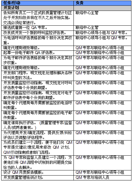 4. 開展項(xiàng)目交流。管理人員必須就新的或者修繕后的QM計(jì)劃與代理商進(jìn)行交流。QM的成功與否與代理商的合作密不可分,如果代理商受邀參與新QM計(jì)劃的開發(fā)并且所有改變都在雙方之間明確交流過,那么成功的機(jī)會(huì)也將大大提高。交流的內(nèi)容應(yīng)包括為什么要開發(fā)這樣一個(gè)計(jì)劃,它的作用和職責(zé)是什么,它對(duì)代理商會(huì)產(chǎn)生哪些影響(對(duì)于他們的評(píng)估和提升)以及它能帶來哪些好處。幫助代理商認(rèn)識(shí)到QM計(jì)劃積極的一面很重要,因?yàn)橹挥羞@樣才能讓他們看到QM不僅僅是管理人員用來告訴他們做錯(cuò)了事情的一種手段。讓聯(lián)絡(luò)中心全體員工參與QM計(jì)劃的開發(fā)能夠建立他們對(duì)該計(jì)劃的支持,提高接受度的同時(shí)避免不知所措。這對(duì)聯(lián)絡(luò)中心剛剛嶄露頭角,QM計(jì)劃還未全面鋪開的中國(guó)市場(chǎng)而言尤為重要。