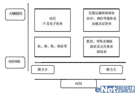 象限2--代表位于該象限的行業(yè)只是初步使用通信產(chǎn)品,并且該行業(yè)對通信產(chǎn)品需求不高,市場空間不大。該行業(yè)主要靠勞動力和自然資源獲取利潤,一般現(xiàn)代化程度較低,對通信要求不高,供應商利潤不大。