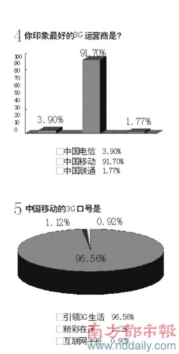 1、中國移動的3G口號是?超過98%的被訪者選擇了“引領(lǐng)3G生活”這一正確選項。2、你是否考慮升級到3G手機(jī)?選擇“會升級”的接近80%。如果考慮升級到3G手機(jī),你最想使用哪家運(yùn)營商的服務(wù)?中國移動奪得了超過九成的選票。但當(dāng)最后問到,“你印象中,中國移動的3G標(biāo)準(zhǔn)是?”時,正確選項T D -SCD M A的得票率竟只有三成左右。