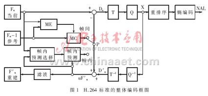 Abstraction Layer),負責(zé)對數(shù)據(jù)進行打包和傳送。H.264編碼圖像通常分為三種類型:I幀、P幀、B幀。I幀為幀內(nèi)編碼幀,其編碼不依賴于已編碼的圖像數(shù)據(jù)。P幀為前向預(yù)測幀,B幀為雙向預(yù)測幀,編碼時都需要根據(jù)參考幀進行運動估計。同時,H.264在提高圖像傳輸容錯性方面做了大量工作,重新定義了適于圖像的結(jié)構(gòu)劃分。在編碼時,圖像幀各部分被劃分到多個Slice結(jié)構(gòu)中,每個Slice都可以被獨立編碼,不受其他部分影響。Slice由圖像最基本的結(jié)構(gòu)——宏塊組成,每個宏塊包含一個16×16的亮度塊和兩個8×8的色度塊。H.264標(biāo)準(zhǔn)的整體編碼框圖如圖1所示。編碼過程中,原始數(shù)據(jù)進入編碼器后,當(dāng)采用幀內(nèi)編碼時,首先選擇相應(yīng)的幀內(nèi)預(yù)測模式進行幀內(nèi)預(yù)測,隨后對實際值和預(yù)測值之間的差值進行變換、量化和嫡編碼,同時編碼后的碼流經(jīng)過反量化和反變換之后重構(gòu)預(yù)測殘差圖像,再與預(yù)測值相加得出重構(gòu)幀,得出的結(jié)果經(jīng)過去塊濾波器平滑后送入幀存儲器。采用幀間編碼時,輸入的圖像塊首先在參考幀中進行運動估計,得到運動矢量。運動估計后的殘差圖像經(jīng)整數(shù)變換、量化和嫡編碼后與運動矢量一起送入信道傳輸。同時另一路碼流以相同的方式重構(gòu)后,經(jīng)去塊濾波后送入幀存儲器作為下一幀編碼的參考圖像。