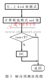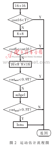 (4)算法替代和改進。幀間預(yù)測的改進:關(guān)于算法的改進主要集中在對me(motion estimation)的改進上,流程如圖2所示。costmin1=min(cost16,cost8,cost16×8,cost8×16),costmin2=min(costmin1,costsub),依次在16×16、8×8、16×8和8×16大小宏塊的整像素位置做預(yù)測,再做次像素估計和幀內(nèi)預(yù)測,選用匹配準(zhǔn)則函數(shù)(采用sad作為匹配準(zhǔn)則函數(shù))取得最小值的模式進行編碼。每計算一種模式,都將sad值與一個經(jīng)驗閥值做比較。當(dāng)sad值小于這個閥值時,立即結(jié)束運動估計,從而減少運算量。