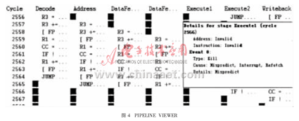 VIEWER工具,如圖4所示。在編寫完成匯編代碼后,可使用該工具觀察運行時流水線的情況。如果有stall等出現(xiàn),會給出原因,優(yōu)化人員根據(jù)工具分析結(jié)果重新更改代碼,提高執(zhí)行效率。