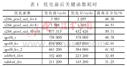 和SRAM 進行擴展,可以訪問多達132 MB的物理存儲器。根據(jù)這樣的特點,將執(zhí)行率更高的代碼放入L1指令緩存中,能使代碼更快地運行。IDE提供了Profile工具,能在運行時統(tǒng)計各個函數(shù)所占的CYCLE數(shù)和占總CYCLE數(shù)的百分比。通過將X264中比較耗時的部分算法代碼,如模式選擇部分代碼放入L1指令空間,能進一步提升運行效率。Profile工具統(tǒng)計結(jié)果同樣也是選擇需要使用匯編優(yōu)化函數(shù)的依據(jù),IDE可根據(jù)Profile結(jié)果對代碼進行優(yōu)化。X264代碼Profile統(tǒng)計結(jié)果與測試數(shù)據(jù)有很大關(guān)系,選用更類似以后應(yīng)用場所的數(shù)據(jù)作為測試數(shù)據(jù),能使統(tǒng)計結(jié)果更接近以后的應(yīng)用環(huán)境。為達到比較準(zhǔn)確的統(tǒng)計結(jié)果,最好在Simulation階段進行統(tǒng)計。雖然這樣非常耗時,但為得到一個準(zhǔn)確的統(tǒng)計作為參考依據(jù)是值得的。此外CACHE