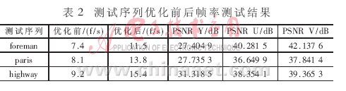 對于不同的總線頻率,優(yōu)化后編碼幀率不同,結(jié)果如表3所示,采用的測試序列為foreman。