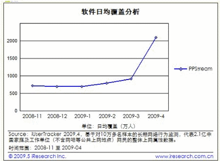 近日,艾瑞四月P2P流媒體數(shù)據(jù)出爐,PPS繼三月登頂后再次衛(wèi)冕成功。然而與三月相比較,PPS在短短一個月內日均覆蓋人數(shù)從910.8萬人暴漲至2093.3萬人,令人乍舌的“驚變”引起了業(yè)內人士甚至廣告主的密切關注。