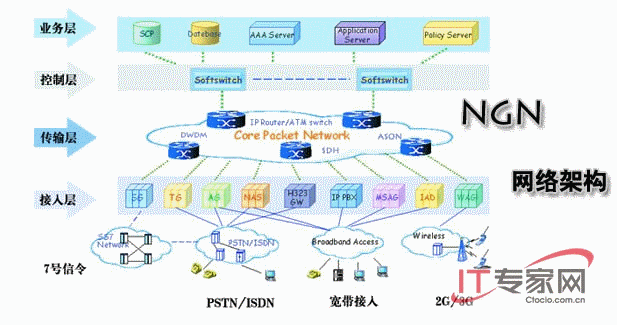工業(yè)和信息化部電信研究院院長(zhǎng)楊澤民也表達(dá)了同樣的觀點(diǎn)。“自NGN出現(xiàn)以來(lái),其定義和重點(diǎn)在不斷變遷。過(guò)去,NGN的重點(diǎn)一直是軟交換和IMS,但現(xiàn)在,NGN的定義越來(lái)越寬泛,幾乎所有面向未來(lái)的組網(wǎng)技術(shù)都可以稱作NGN,VDSL/VDSL2、PON等寬帶接人技術(shù),WiFi、WiMAX等寬帶無(wú)線技術(shù)、支持FMC的各種技術(shù)、運(yùn)營(yíng)商級(jí)以太網(wǎng)、家庭網(wǎng)絡(luò)技術(shù)等等都可以歸為NGN的范疇。”他說(shuō)。