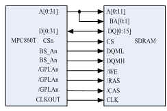 SDRAM的CLK信號(hào)由MPC860T的輸出時(shí)鐘CLKOUT驅(qū)動(dòng),/WE、/RAS和/CAS信號(hào)分別由UPMA的GPLA1~GPLA3產(chǎn)生。SDRAM的A10引腳要復(fù)用于SDRAM的刷新控制,因而必須與GPLAO相連(由于不方便連線圖中未畫出),因?yàn)镸PC860T的GPLAO可以通過編程實(shí)現(xiàn)控制信號(hào)與地址信號(hào)的復(fù)用。MT48LC4M16A2內(nèi)部有12條行地址和8條列地址,行地址為高位地址,列地址為低位地址,而外部僅有12條地址信號(hào)A0~A11。這就需要對(duì)UPM對(duì)地址進(jìn)行復(fù)用。MPC860T支持內(nèi)部地址復(fù)用,可以通過UPM的RAM字中的AMX位進(jìn)行配置,同時(shí)將OR寄存器中的SAM位同時(shí)進(jìn)行配置。相關(guān)寄存器配置為:BR2=Ox0000081,說明:32位寬,無奇偶校驗(yàn),無寫保護(hù),選擇UPMA,基地址00000000;OR2=OxFF000A00,說明:16Mbyte容量,地址復(fù)用。