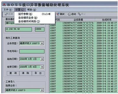 利用BOSS接口異常數(shù)據(jù)輔助處理系統(tǒng)執(zhí)行以上應急流程的方式是:在提取號碼后,根據(jù)客服協(xié)議開機命令字10007格式要求(HandsetNo~工號~返回格式~nCode~sType~備注),將批量號碼構造成報文列表并導入系統(tǒng)執(zhí)行。主界面如圖5所示。