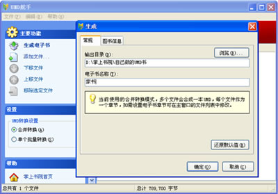 點擊“添加文件”,將你想要轉(zhuǎn)換的電子書添加至軟件窗口,大批量轉(zhuǎn)換的用戶可一次性選中多個文件添加,添加完畢后,你可以隨時通過“上移文件”和“下移文件”按鈕來調(diào)整你文件擺放的位置,或者移除不需要轉(zhuǎn)換的文件。確認后,選擇合并轉(zhuǎn)換或是單個批量轉(zhuǎn)換,合并轉(zhuǎn)換是將添加的文件合并成一本UMD電子書,單個批量轉(zhuǎn)換是每個文件生成一本UMD電子書。設(shè)置完后點擊“生成電子書”,在彈出的對話框中設(shè)置輸出目錄、電子書名稱、電子書封面、作者、來源后點擊確認,出現(xiàn)正在轉(zhuǎn)換的進度條,完成制作后會自動打開電子書所在的目錄,你的電子書制作完成,是不是非常簡單。