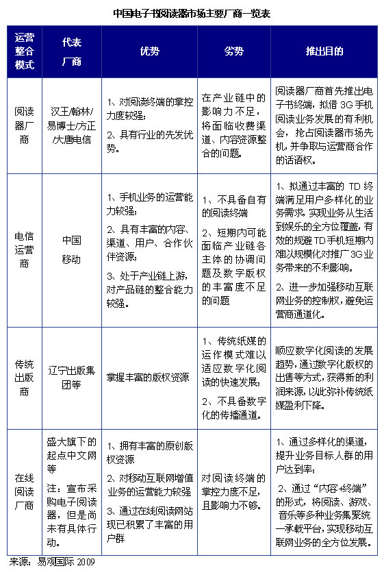 International)分析認(rèn)為,目前中國電子書市場(chǎng)以閱讀器廠商及電信運(yùn)營商兩種力量為主導(dǎo),此外還包括傳統(tǒng)出版商、在線閱讀廠商等其他力量。對(duì)現(xiàn)有各種運(yùn)營模式的企業(yè)分析如下: