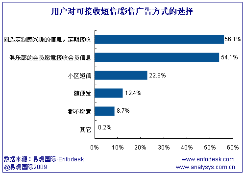 從用戶對(duì)短信廣告的接受程度來看,用戶對(duì)于自己感興趣領(lǐng)域的短信廣告并不反感,甚至樂于接受或定制。根據(jù)易觀國際Enfodesk發(fā)布的用戶調(diào)研數(shù)據(jù),56.1%的用戶愿意定制自己感興趣的信息,54.1%的用戶愿意接受會(huì)員信息,只有8.7%的用戶不愿意接受任何形式的短信/彩信廣告。但是這類用戶樂于接受的短信廣告反而一般有固定的端口號(hào),更容易被攔截,因此易觀國際(Analysys International)認(rèn)為,該短信過濾業(yè)務(wù)更加傾向于攔截對(duì)用戶相對(duì)更有價(jià)值的信息,造成垃圾信息“驅(qū)逐”有價(jià)值信息的結(jié)果,不利于短信廣告行業(yè)的健康發(fā)展。