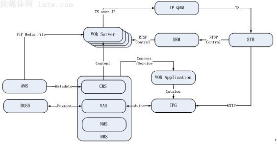 QAM則是網(wǎng)絡(luò)設(shè)備產(chǎn)品,因此交互平臺架構(gòu)的核心組成包括:視頻服務(wù)系統(tǒng)VOD Server、業(yè)務(wù)管理系統(tǒng)BMS、會話和資源管理系統(tǒng)SRM、應(yīng)用管理系統(tǒng)VOD