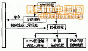 在軟件設(shè)計(jì)方面包括兩部分,一部分是監(jiān)控終端的監(jiān)控軟件,另一部分是各便件的底層軟件。監(jiān)控終端采用了多線程的軟件設(shè)計(jì)方法,系統(tǒng)對連接的每一個監(jiān)控點(diǎn)共采用了6個線程,即網(wǎng)絡(luò)監(jiān)聽線程、發(fā)送線程、接受線程、H.26 3圖像解碼顯示線程、圖像保存線程和記錄信息(門口終端的撥號、門禁一卡通等記錄信息)檢測線程,如圖4所示。