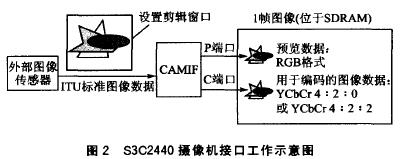YCbCr8比特標(biāo)準(zhǔn)的圖像數(shù)據(jù)輸入,最大可采樣4096×4096像素的圖像。攝像頭接口可以有兩種模式與DMA控制器進行數(shù)據(jù)傳輸:一種是P端口模式,把從攝像頭接口采樣到的圖像數(shù)據(jù)轉(zhuǎn)為RGB數(shù)據(jù),并在DMA控制下傳輸?shù)絊DRAM(一般這種模式用來提供圖像預(yù)覽功能);另一種是C端口模式,把圖像數(shù)據(jù)按照YCbCr4:2:0或4:2:2的格式傳輸?shù)絊DRAM(這種模式主要為MPEG-4、H.263等編碼器提供圖像數(shù)據(jù)的輸入)。上述兩種工作模式都允許設(shè)置一個剪輯窗口,只有進入這個窗口的圖像數(shù)據(jù)才能夠傳輸?shù)絊DRAM。上述過程可用圖2說明。