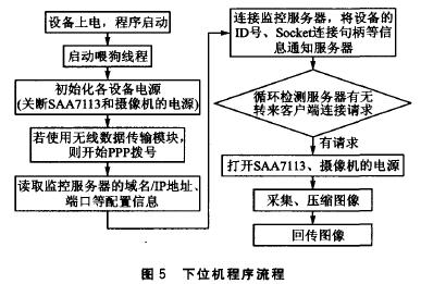下位機軟件通過驅(qū)動程序提供的接口,在遠(yuǎn)程圖像監(jiān)控設(shè)備中完成硬件的初始化、控制等功能,同時又負(fù)責(zé)圖像的壓縮和傳輸。它是所有設(shè)備的控制中樞,因此這里著重描述下位機軟件的工作流程,如圖5所示。