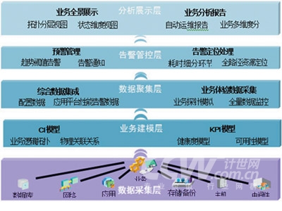 業(yè)務(wù)建模層: 是整個(gè)監(jiān)控系統(tǒng)的核心,是將業(yè)務(wù)進(jìn)行有形化管理、量化衡量的高效手段。該業(yè)務(wù)建模層中涵蓋了幾乎所有的BOSS管理資源要素,包括業(yè)務(wù)、應(yīng)用、服務(wù)及其他平臺(tái)類資源,這些信息都建立并實(shí)時(shí)更新于企業(yè)集中建設(shè)的符合ITIL標(biāo)準(zhǔn)的CMDB(配置資源數(shù)據(jù)庫(kù),其中每一子項(xiàng)便是一個(gè)CI配置資源項(xiàng))中;贑MDB中動(dòng)態(tài)調(diào)整的實(shí)時(shí)CI項(xiàng)和相互關(guān)系,關(guān)聯(lián)上能夠反映業(yè)務(wù)當(dāng)前狀況的KPI指標(biāo),以結(jié)構(gòu)化的模型框架為指導(dǎo),建立完整的業(yè)務(wù)CI/KPI指標(biāo)體系,繪制出以業(yè)務(wù)為中心的BOSS系統(tǒng)視圖,全面展現(xiàn)其健康度和可用性。