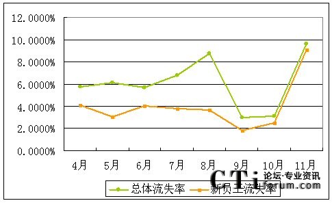 從上表中可以看出,該呼叫中心的總體流失率在4-11月期間并沒有呈現(xiàn)特別的趨勢性,11月份流失率的突增原因是在于該月有大量新員工(入職3個月內(nèi)的員工)流失,占到該月總流失人數(shù)的94.12%。