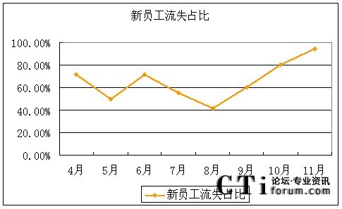 而對流失員工的結(jié)構(gòu)性分析我們發(fā)現(xiàn),4-11月期間新員工流失占總體流失人數(shù)的比例在不斷上升,4-8月基本在50%上下波動,而從9月份開始直線上升,到11月份更達(dá)到了占到流失總?cè)藬?shù)的94.12%。當(dāng)月有16名入職不到三個月的新員工離職,而老員工只有1人離職。