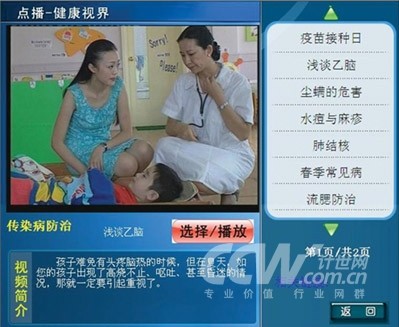 e-Health平臺(tái)提供了大量的健康視頻及電子雜志信息,以三網(wǎng)融合的網(wǎng)絡(luò)為基礎(chǔ),通過(guò)互動(dòng)電視、網(wǎng)站、手機(jī)短信(隨著手機(jī)3G的推出,將給居民提供手機(jī)Web和手機(jī)視頻服務(wù))等形式,給居民提供廣覆蓋式的健康教育。同時(shí),該平臺(tái)和居民健康檔案集成后,可以根據(jù)居民所處不同時(shí)期、不同的健康狀態(tài),為居民提供個(gè)性化的、有針對(duì)性的健康教育內(nèi)容。