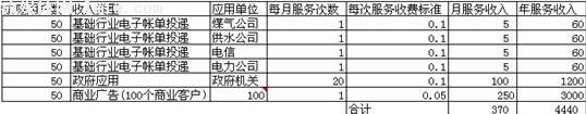那么如果一家運(yùn)營(yíng)商已經(jīng)設(shè)計(jì)出了符合市場(chǎng)需求的業(yè)務(wù)模式,未來的盈利前景將會(huì)怎樣呢?不妨讓我們模擬分析一下。假設(shè)一個(gè)運(yùn)營(yíng)商擁有50萬左右的城市家庭用戶。在基礎(chǔ)行業(yè)領(lǐng)域,每月可以幫助煤氣、供水、電信和電力公司各發(fā)送1次賬單;在商業(yè)客戶方面,擁有百家左右的合作伙伴,每月每家合作伙伴發(fā)送1條短信廣告;在政府機(jī)關(guān)領(lǐng)域,粗略估算政府機(jī)關(guān)每月總計(jì)使用20次左右;每個(gè)家庭用戶則每月收到電信短信約125條。假設(shè)運(yùn)營(yíng)商的服務(wù)資費(fèi)中,除了商業(yè)廣告為0.05元/條外,均為0.1元/條。那么,盈利情況又該怎樣呢?