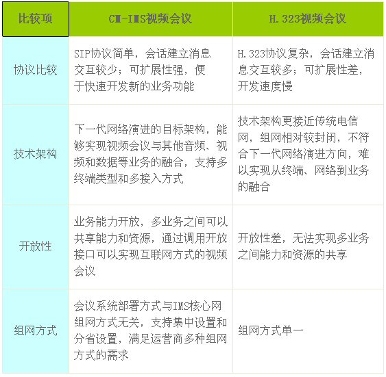 IMS是下一代網(wǎng)絡(luò)演進(jìn)的核心技術(shù),基于中國移動CM-IMS的視頻會議在全面支持語音、視頻、數(shù)據(jù)會議和高清會議功能的同時,有效解決了傳統(tǒng)H.323會議系統(tǒng)互通性差、終端要求高、業(yè)務(wù)可擴展性低等問題,成為中國移動視頻會議發(fā)展的主流技術(shù)。CM-IMS的視頻會議與傳統(tǒng)的H.323會議相比,具有以下技術(shù)優(yōu)勢: