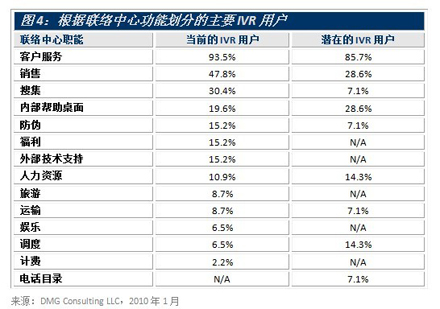 圖4顯示使用IVR的聯(lián)絡(luò)中心類型分布非常廣泛。這些聯(lián)絡(luò)中心主要支持外部客戶,如客戶服務(wù)、銷售、識(shí)別真假和搜集信息,但同時(shí)它也被用來(lái)幫助內(nèi)部客戶,如人力資源、內(nèi)部幫助桌面。DMG希望在未來(lái)幾年里看到更多語(yǔ)音自助服務(wù)軟件的內(nèi)部應(yīng)用,尤其考慮到現(xiàn)在企業(yè)能從托管服務(wù)提供商那里獲得高度可裁減的IVR解決方案,他們只需為自己所使用到的那部分付費(fèi)就可以了。