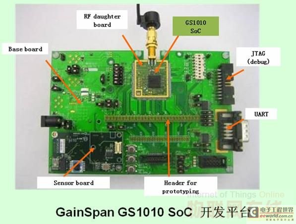 為了幫助客戶縮短開發(fā)周期, GainSpan還提供了一整套包括SDK、評估平臺、開發(fā)平臺在內(nèi)的軟硬件工具。其軟件棧包括了各種I/O驅(qū)動和WLAN固件、RTOS、網(wǎng)絡(luò)棧、系統(tǒng)服務(wù)、WLAN和I/O服務(wù)模塊、各種應(yīng)用編程接口以及應(yīng)用軟件。Parmar聲稱,GS1010的SDK能夠幫助工程師節(jié)約10~12個月的開發(fā)時間。而硬件開發(fā)平臺則能夠支持溫度、濕度、光敏、壓力、加速度等各種傳感器,并預(yù)留了客戶自選的傳感器接口和調(diào)試以及程序燒錄接口。