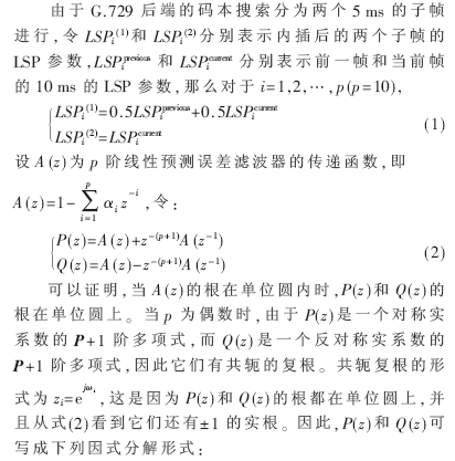 G.729的編碼過程如下:輸入8 kHz采樣的數(shù)字語音信號先經(jīng)過高通濾波預處理,每10 ms幀作一次線性預測分析,計算10階線性預測濾波器系數(shù),然后把這些系數(shù)轉換為線譜對(LSP)參數(shù),采用兩級矢量量化技術進行量化。自適應碼本搜索時,以原始語音與合成語音的誤差知覺加權最小為測度進行搜索。固定碼本采用代數(shù)碼本機構。激勵參數(shù)(自適應碼本和固定碼本參數(shù))每個子幀(5 ms,40個樣點)確定一次。