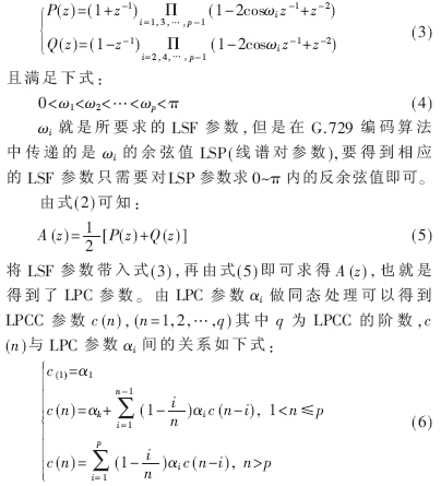 本文選擇G.729編碼幀中第一子幀的LSP(1)參數(shù)的反余弦LSF及由其轉換得到的LPC、LPCC參數(shù)作為聲道特征參數(shù)。