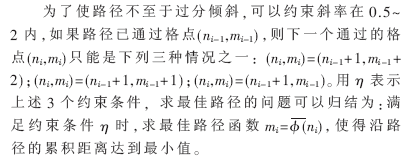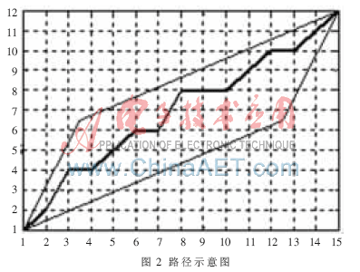 把測試模版的各個幀號n=1,…,N在一個二維直角坐標系的橫軸上標出,把參考模版的各幀號m=1,…,M在縱軸上標出,通過這些表示幀號的整數(shù)坐標畫出的橫縱線即可形成一個網(wǎng)格,網(wǎng)格中的每一個交叉點(n,m)表示測試模版中某一幀與訓練模版中某一幀的交叉點。動態(tài)規(guī)劃算法可以歸結為尋找一條通過此網(wǎng)格中若干格點的路徑,路徑通過的格點即為測試和參考模版中距離計算的幀號。
