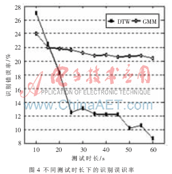 圖4給出基于DTW識別方法與GMM模型(混元數(shù)64)識別G.729編碼方案863語料庫的文本相關說話人的誤識率對比圖。橫坐標代表的測試語音的時長,縱坐標代表識別誤識率。由實驗結果可知在文本相關的說話人識別中,基于DTW算法的識別率在絕大多數(shù)情況下高于GMM模型,且隨著測試語音的增長,優(yōu)勢更明顯。