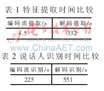 表1為特征提取時間比較結果,表2為說話人識別時間比較結果。