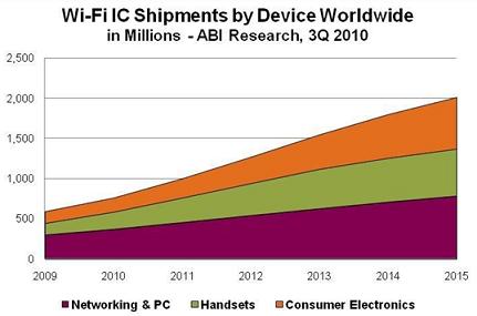 Wi-Fi技術(shù)現(xiàn)已被用于幾乎所有筆記本和上網(wǎng)本、智能電話和游戲設(shè)備。電話、音頻播放器、打印機、機頂盒以及其他消費類電子設(shè)備對Wi-Fi技術(shù)的采用率也在不斷增加,來自Wi-Fi聯(lián)盟和多家調(diào)研機構(gòu)的數(shù)據(jù)印證了這種市場增長趨勢。2009年,僅在中國銷售的具備Wi-Fi功能的筆記本電腦就達到800萬臺,全球Wi-Fi設(shè)備認證數(shù)量則增加了約50%,消費類電子設(shè)備和電話數(shù)量增加了100%以上。截止到2010年7月,消費類電子設(shè)施與電話類產(chǎn)品的認證數(shù)量已經(jīng)超過了2009年全年數(shù)量,預(yù)計全年售出約8億臺Wi-Fi設(shè)備。
