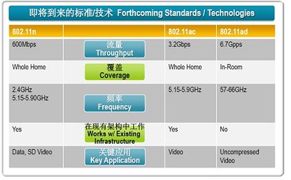 在802.11a/b/g/n等標準不斷刷新更高覆蓋率和數(shù)據(jù)傳輸率的同時,新的標準如802.11ac、802.11ad等都正在嶄露頭角。Michael介紹說,與802.11n 600Mbps的流量相比,ac和ad的流量將分別高達3.2Gbps和6.7Gbps,頻率范圍分別為5.15GHz~5.9GHz和57GHz~66GHz。從應(yīng)用角度看,ac會定位在整個家居多個室內(nèi)的多媒體內(nèi)容共享;而ad由于傳輸距離有限,用于單個居室內(nèi)未壓縮高清視頻的短距離傳輸,即可能會成為HDMI標準的替代者。