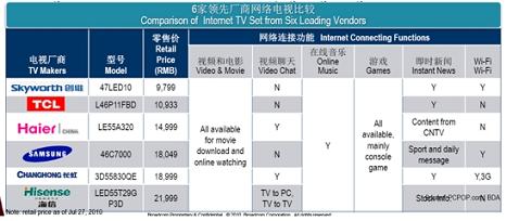 “相比國外廠商認為規(guī)則尚不明確,持保守態(tài)度,國內(nèi)的電視機廠商比國外同行顯得更熱衷網(wǎng)絡(luò)電視!盡ichael表示,“長虹、TCL、海信、康佳及創(chuàng)維等廠商都在2009年推出了各自的網(wǎng)絡(luò)電視系列,網(wǎng)絡(luò)電視被國內(nèi)電視廠商視為開拓藍海市場,獲取更多利用的機會。尤其在三網(wǎng)融合的背景下,網(wǎng)絡(luò)電視在中國被普遍認為將有很大前景!