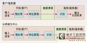 3G手機(jī)的ASR應(yīng)用設(shè)計(jì)可分為兩類(lèi),即以終端為中心和以客戶(hù)/服務(wù)器為中心的應(yīng)用。如圖1所示為以終端為中心的設(shè)計(jì)方法,3G手機(jī)(終端)執(zhí)行整個(gè)語(yǔ)音識(shí)別過(guò)程并送出識(shí)別結(jié)果。在圖2所示的客戶(hù)/服務(wù)器方法中,終端只是執(zhí)行預(yù)處理特征提取,然后通過(guò)一個(gè)誤碼受保護(hù)的數(shù)據(jù)信道將這些參數(shù)發(fā)送給中心服務(wù)器,中心服務(wù)器最終完成語(yǔ)音識(shí)別。如果采用以客戶(hù)/服務(wù)器為中心的設(shè)計(jì)方法,3G手機(jī)應(yīng)使用數(shù)據(jù)信道而非移動(dòng)信道來(lái)將語(yǔ)音發(fā)送給服務(wù)器進(jìn)行識(shí)別,因?yàn)橐苿?dòng)信道所用的低速率語(yǔ)音編碼會(huì)嚴(yán)重影響語(yǔ)音識(shí)別的性能。