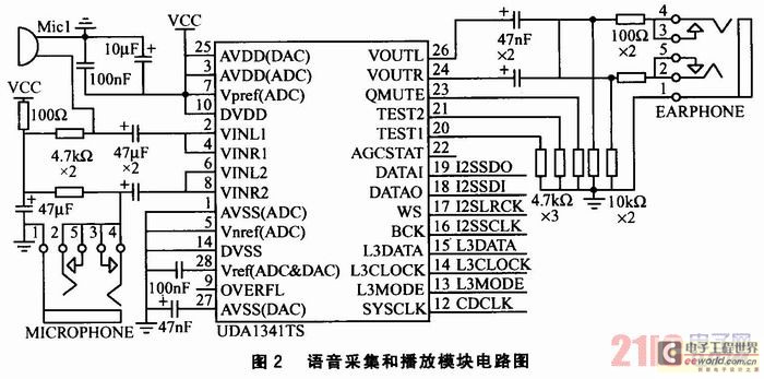 語音采集和播放模塊的作用是將音頻模擬信號轉(zhuǎn)換為數(shù)字信號,并對信號進行PCM編碼。其電路如圖2所示。采用Philips公司的UDA1341 TS型立體聲音頻CODEC進行音頻編解碼。該芯片提供2個麥克風(fēng)輸入,可實現(xiàn)單端輸入、差分輸入等靈活配置,并設(shè)置了可編程增益放大器和自動增益控制器,可保證高質(zhì)量的音頻獲取;同時,還集成了聽筒和喇叭輸出的驅(qū)動器,喇叭音量可以通過編程調(diào)整。S3C2440A-40微處理器與UDA1341TS編解碼器通過I2S總線直接相連,并采用DMA發(fā)送/接收方式,完成系統(tǒng)的錄音和放音。