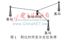 TDOA定位技術(shù)是根據(jù)不同基站接收到的同一移動終端信號在傳輸路徑上的時延差異實現(xiàn)終端定位。當(dāng)移動終端發(fā)出緊急呼叫時,移動網(wǎng)絡(luò)通過其附近的三個或更多個不同基站接收并測量出信號的到達時間,網(wǎng)絡(luò)計算出到達時間兩兩之間的差值,移動終端必然位于這些時間差值所對應(yīng)的以兩兩基站為焦點的雙曲線上[2]。這樣,根據(jù)兩條雙曲線的交點就能夠確定手機的位置。所以只要附近三個基站接收到移動終端發(fā)出的信號就可以達到定位目的。TDOA技術(shù)只需要移動通信網(wǎng)絡(luò)參與網(wǎng)絡(luò)參數(shù)的測量,不需要對終端硬件上的改動。因此實現(xiàn)TDOA定位只需要在移動通信網(wǎng)中增加相應(yīng)功能模塊就可以了,并支持所有廠商生產(chǎn)的移動終端。同時它具有定位精度高、響應(yīng)時間短、實現(xiàn)簡單等優(yōu)點。