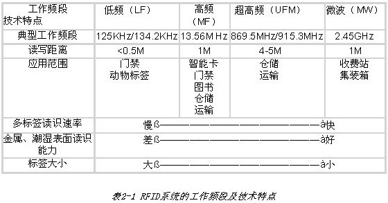 RFID系統(tǒng)的工作頻段可以為低頻(LF)(30-300kHz,典型頻率有125 kHz,134.2 kHz)、高頻(HF)(3-30MHz,典型頻率為13.56M Hz)、超高頻(UHF)(300-968MHz,典型頻率869.6MHz、915.3MHz)、微波(MW)(2.45-5.8GHz,典型頻率為2.45GHz)等四個(gè)頻段,具體的頻點(diǎn)由各個(gè)國(guó)家或地區(qū)的無線電管理部門確定。根據(jù)不同的工作頻段,在無源的情況下,其技術(shù)特點(diǎn)和應(yīng)用范圍也不同,如下表所示: