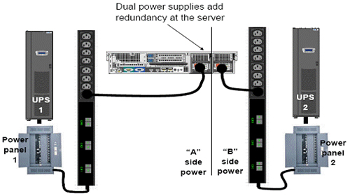 2(N)架構(gòu)與含有雙電源的服務(wù)器配合使用。在這種排列中,每個電源一般都是利用一個獨立的供電路徑。那樣,即使整個動力總成都關(guān)機進行維修或維護,服務(wù)器仍然可用。