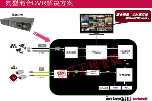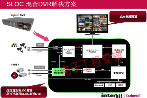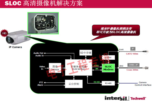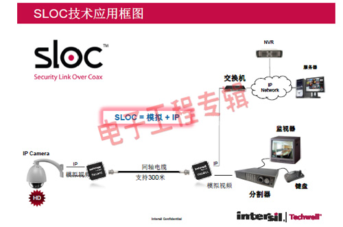 革命性的Intersil Techwell SLOCTM(Security Link over Coax)同軸電纜復(fù)合視頻傳輸解決方案是可通過一條同軸電纜同時傳輸模擬 CVBS 視頻和高清數(shù)字 IP 視頻信號的先進調(diào)制解調(diào)器解決方案,其采用最新MODEM PHY技術(shù)的傳輸解決方案,可以基于同軸電纜同時傳輸高清IP碼流和標清模擬實時視頻。