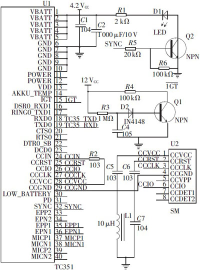 。由于該模塊電源引腳有5個,且電壓都是3.3~4.8V,因此本設計將5個引腳連在一起,直接接到外部4.2V電源上。但是本系統(tǒng)的外部電源是12V的直流電流,所以設計時采用LM2941穩(wěn)壓為4.2V.GPRS模塊上的引腳IGT主要是用于點火復位,其作用是作為GPRS模塊的一個復位轉(zhuǎn)換系統(tǒng),加電后為使TC35I進入工作狀態(tài),必須給IGT加一個大于100ms的低脈沖,電平下降持續(xù)時間不可超過1ms,這里通過RC電路來實現(xiàn)。TC35I的第32腳SYNC引腳有兩種工作模式,一種是指示發(fā)射狀態(tài)時的功率增長情況,另一種是指示TC35I的工作狀態(tài),可用AT命令AT+SYNC進行切換,本模塊使用的是后一種。GPRS模塊和單片機之間的數(shù)據(jù)通信主要是通過端口TXD0與TXD之間、RXD0與RXD之間的數(shù)據(jù)傳輸來完成。其中,GPRS模塊上的TXD0口用于接收從單片機傳來的數(shù)據(jù),而單片機上的TXD端口用于向GPRS模塊傳送數(shù)據(jù)。GPRS模塊上的RXD0口用于向單片機發(fā)送數(shù)據(jù),單片機的RXD口則用于接收從GPRS模塊傳輸來的數(shù)據(jù)。在TC35I的基帶處理器上有一個綜合SIM接口,該接口直接接線到主機接口(端到端連接器),用于連接到外部的SIM卡座。本系統(tǒng)接的SIM卡有CCCLK、CCVCC、CCIO、CCRST、CCIN、CCGND