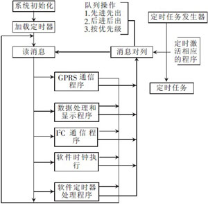 該下位機軟件設計包括主程序、顯示子程序和通信服務程序的設計。主程序主要完成中斷的初始化和串口的初始化設置。顯示程序主要完成數(shù)據(jù)的各種顯示,顯示部分采用動態(tài)掃描的方式,實現(xiàn)對顯示屏要顯示的漢字、圖像、字符等數(shù)據(jù)信息進行傳輸控制以及顯示等功能。通信服務程序主要完成GPRS的數(shù)據(jù)接收、數(shù)據(jù)的分割處理、數(shù)據(jù)的發(fā)送等任務。本文采用模塊化程序設計,程序各部分的功能由各個模塊分別實現(xiàn)。程序模塊有:系統(tǒng)初始化模塊、GPRS通信模塊、數(shù)據(jù)的處理和存儲模塊、I2C通信模塊。為了保證系統(tǒng)工作的實時性和高效性,本系統(tǒng)采用了實用單片機系統(tǒng)MS3,MS3是一套針對MCU51的開發(fā)平臺,借簽了VC編程的消息機制,把各個功能有效地組織起來。RTOS的系統(tǒng)時鐘,實現(xiàn)高效的按鍵掃描和快速的響應中斷,執(zhí)行例行程序。顯示終端主程序如圖所示。